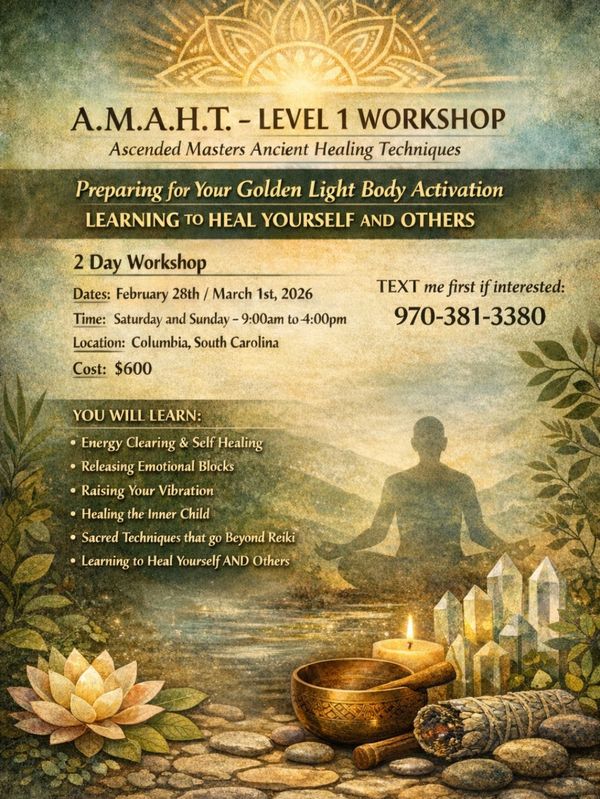 Through A.M.A.H.T. — Ascended Masters Ancient Healing Techniques — you will learn to channel powerful energies from the Ascended Masters, expand your intuitive gifts, and step into your higher calling.