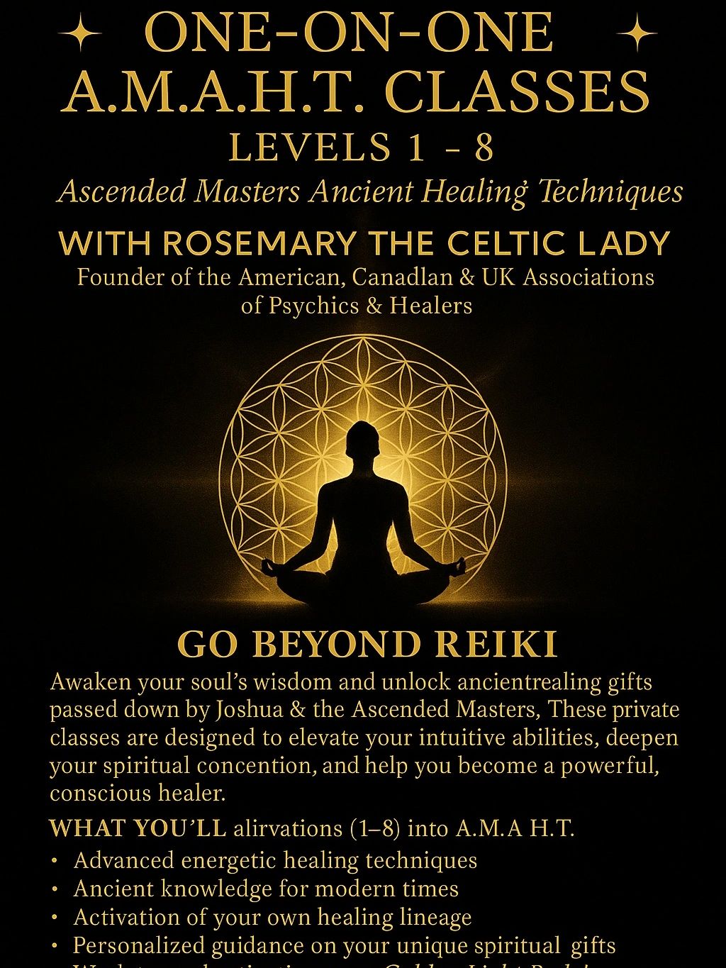 Join me, Rosemary The Celtic Lady, for One-on-One A.M.A.H.T. Classes (Levels 1–8) — a powerful journey into the Ascended Masters Ancient Healing Techniques.